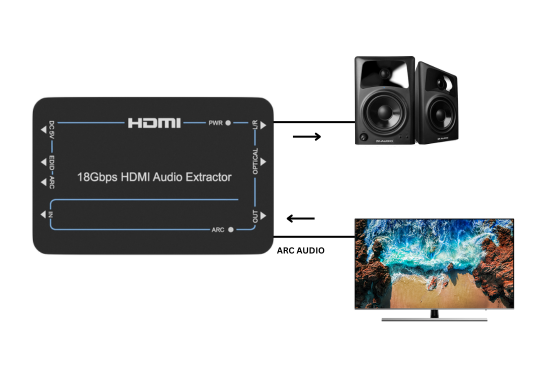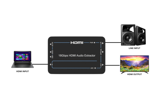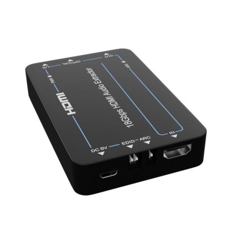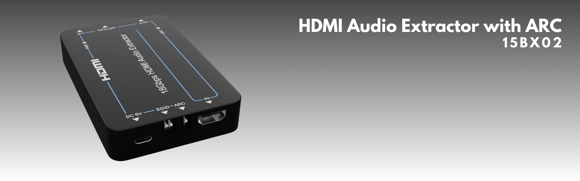 nT15BX02 18Gpbs HDMI Audio Extractor can extract audio signals from the HDMI source to output to A/V receivers via the Optical port and L/R analog audio port. The device also has a built-in HDMI output port which can connect to an ARC-compatible display and return the received audio to the amplifier or speaker via the optical port when the ARC is enabled. The input and output video resolution can reach up to 4K×2K@60Hz (YUV 4:4:4). The product supports smart EDID management, and both EDID and ARC functions can be controlled via DIP switches on the front panel.