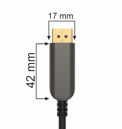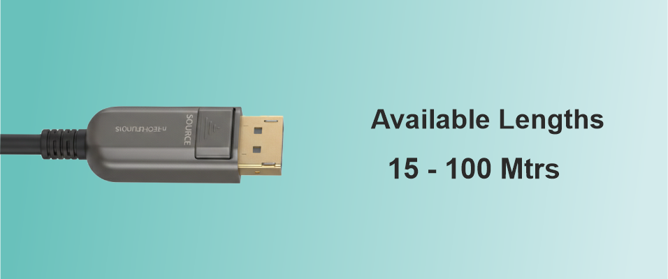 DP M to DP M Fiber Cable is built with hybrid ofc fiber and copper cable to give the best 8K 60 Hz audio and video experience for the distance up to 100 mtrs .The cable supports digital audio and video signals .Rugged Fiber optic engine used at both ends to convert video and audio signals to fiber to video and audio signals . The gold plated shell and the pins provides best interface connection and the optical cable supports emi and rf free signals to provide the disturbance free experience . The cable construction is designed to give bandwidth of 40 Gbps . Available in Black colour in lengths from 15 Mtrs to 100 Mtrs . Suitable for Medical Equipments , Conference rooms , Huddle rooms , Training rooms , Educational , Military applications .