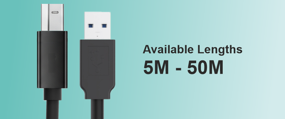 USB 3.0 Active A m to B m CABLE enables to connect a usb 3.0 device beyond 5 meters without signal loss . The usb 3.0 active cable supports data transfer speeds up to 5 gbps . The cable is backward compatible with usb 2.0 and usb 1.1 devices . Usb A male port is to be connected to the host device and the usb B male port is to be connected to the slave device . The cable is plug and play , hot swappable and no driver required . Power supply input given at usb B male side . Compatible with windows , mac and android systems . Available lengths from 5 meters to 50 meters. Applications machine vision ,video conference camera , speakers , printers , scanners , keyboard , mouse , storage devices …..