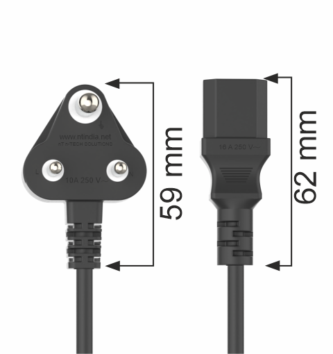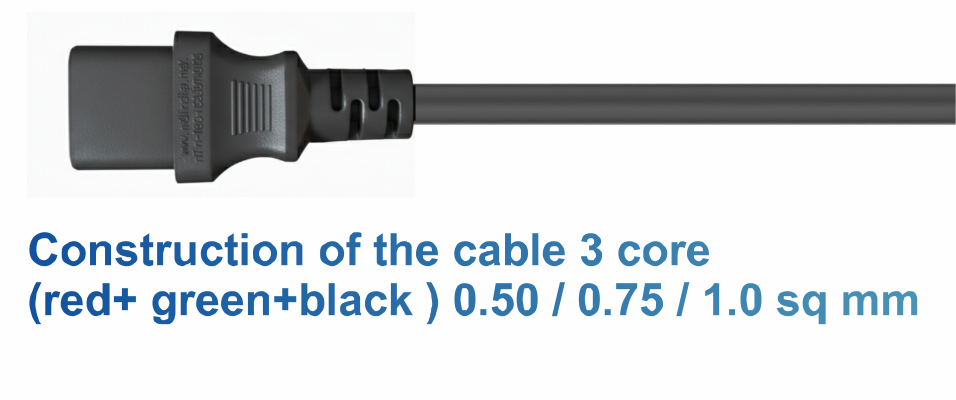 3 P TO C13 Power cord isa 6 Amp power cord made with 3 core 0.5 / 0.7 5 / 1.0 sq mm power cable . The connectors are heavy duty and rugged and is over moulded for longer life . The 3 pin connectors is made up of brass – nickel coated pin . The connection betweeen the cable and connector is crimping – in order to avoid any loose connections and to avoid loose connections in case any heat generates in future . The cable enables connection between 3 pin power socket to iec 14 socket of the devices . IEC 13 pin avoids direct contact of pins in open environment to avoid shocks to customers . The power cord is widely used with most of the devices like computers , monitors , appliances , machines and equipments ….