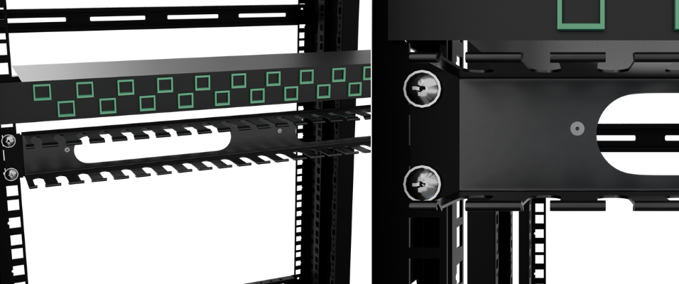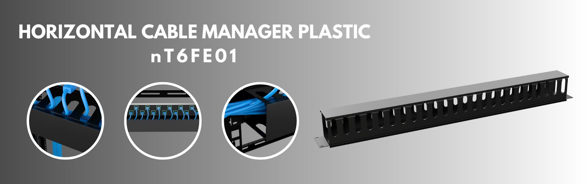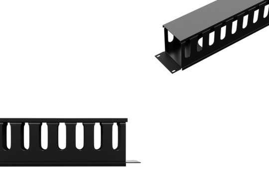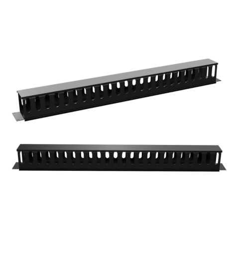 nT6FE01 24 port Slotted Cable Manager is 19 ” rack mountable cable manager with slots for 24 cables up and 24 cables down . The patch cords and cables with connectors can pass through the manager to make the conenctions to patch panles / siwtch more organised , clean and manageable . When the cables have to come on front from left and right front side and passthrough from back sides , this cable manager is the right solution for handeling the cables with clutter free , neat and access to each cable . The cable manager The cable manager has removable plastic cover in front – for accessing the cables and latter covering it for aesthetix and claan finishing . The cable manager is made up of PVC Plastic and it is of 1 u size . It makes the cabeling easy to access , neat , clean and manageable . The cables can be identified quickly and easily . Each cable can be taken out seperately without disturbing the entire cable bunch . Cable manager saves time , space and gives a aesthetic finish and easy identification to the cabels . Available in black colour .
