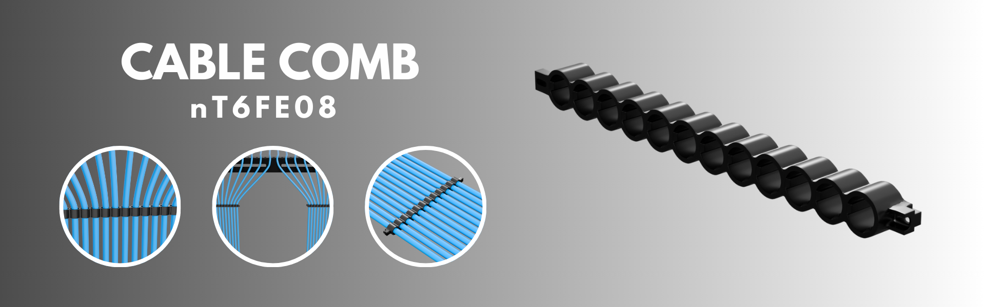 nT6FE08 12 port Cable comb is best suitable in the places where mulitple cables come in a row for connecting on patch panels or switches . This makes the set of the cables come in a line and together insted of hanging . It makes the cabeling easy to access , neat , clean and manageable . The cables can be identified quickly and easily . Cable comb saves time , space and gives a aesthetic finish and easy identification to the cabels . Available in black colour .