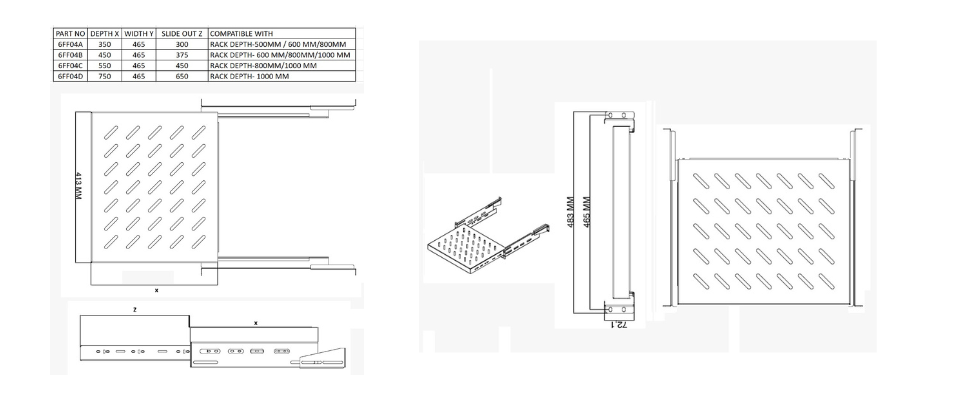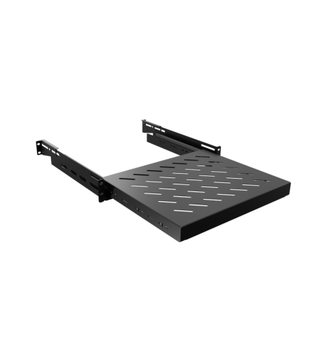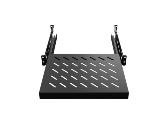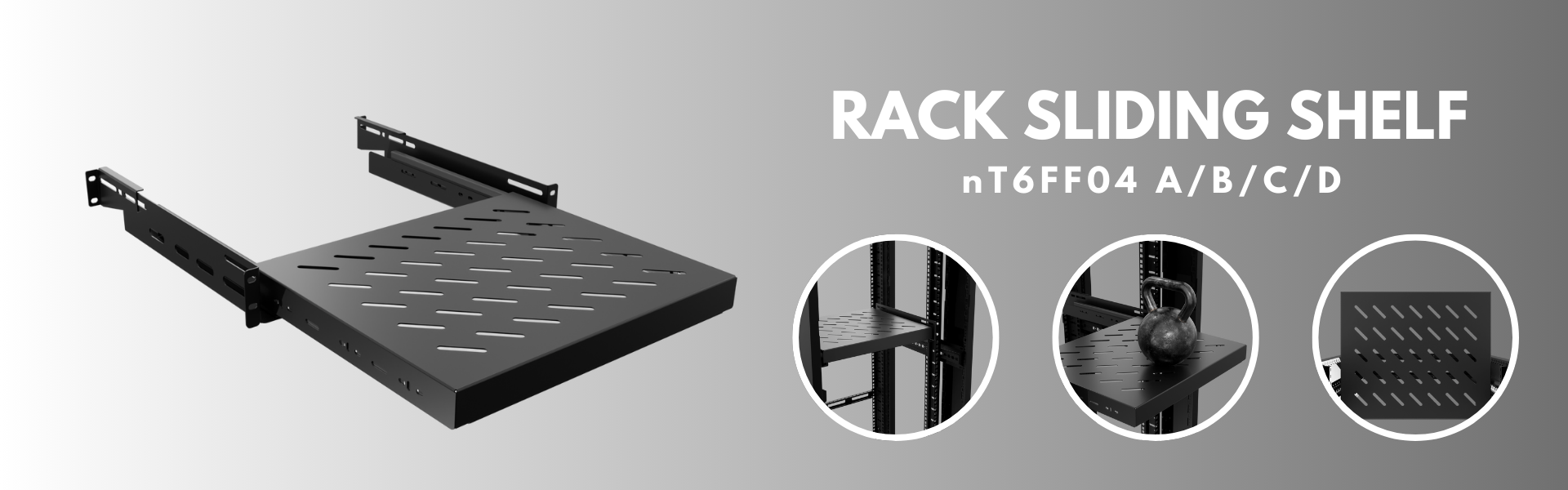 nT6FF04 Rack Sliding tray is 19 ” rack mountable sliding shelf for equiments .The sliding shelf can be pulled out and pushed back into the Rack . The sliding shelf can hold up to 15 kgs of equipment . The sliding tray is made up of CR Powder coated steel and heavy duty sliding telescopic channeles are used for stable and long life . The mounting size is 19″ and 1 u . The sliding shelf is available in 4 depths – 6FF04 A – 300 mm (suitable for 600×450 ) ,6FF04 B -450 mm suitable for 600×600 ) 6FF04 C -550 mm suitable for 600×800 ) ,6FF04 D – 750 mm mm (suitable for 600×1000 ) . The Sliding shelf are provided with adjustable mounting ears for the back side fixing – so that it can be mounted in diffent rack sizes . Available in Black Colour .