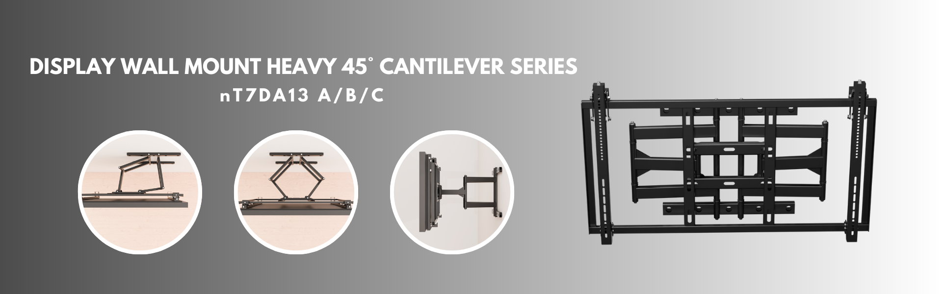 nT07DA13 A/B/C is a heavy duty swivel cantilever mount for display, The mount is made up of powder coated cr steel . The gauge of steel used is 2.0 mm to 4 mm – The swivel mount is simple to use and rugged in design . it offers various feature like smooth movement , pull out , push back , left right tilting , front back tilting , up down keystone adjustment . The mount has 45 degree of swivel movement in left and right . mount is available in black color and also it can be provided in white on order . The mount is available in 3 models nT07DBA13 A suitable for displays from 55″ to 98″ vesa 1000×600 weight capacity – 100 Kgs, nT07DA13B suitable for display from 75″ to 100″- vesa 1200×600- weight capacity – 100 Kgs , nT07DA13C suitable for display from 75″ to 105″- vesa 1500×600- weight capacity – 110 Kgs . Smooth swivel function makes it easy tfor installation , easy servicing and maintenance . suitable for office, home, reception, digital signage, restaurants, educational and hospital applications