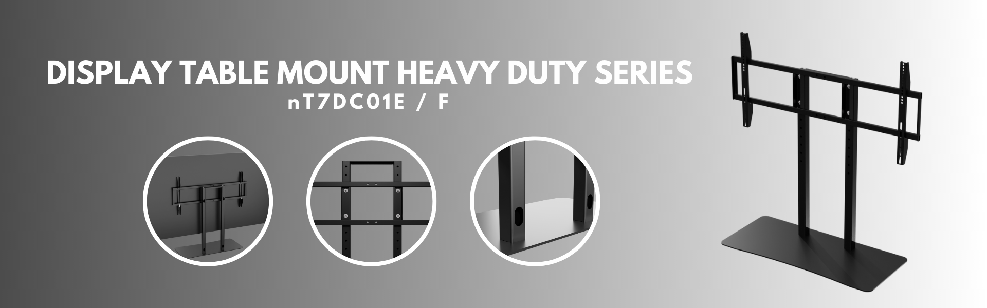 nT7DC01 is a heavy duty table mount for displays ranging from 57 ” to 86 ” . Available in Black Colour . The table mount is simple to assemble and use and rugged designed – it offers various feature like height adjustment, compatibility for adding video bar , Heavy duty base for stability , Dual pillar for stablity and balance . The mount is available in black color and also it can be provided in white on order The mount is available in 3 models nT07DC01E suitable for displays from 42″ to 75″ vesa 800×400 weight capacity – 60 Kgs, nT07DC01F suitable for display from 55″ to 86″- vesa 1000×600- weight capacity – 60 Kgs . suitable for office, home, reception, digital signage, restaurants, educational and hospital applications