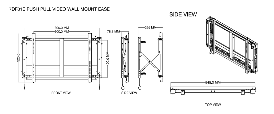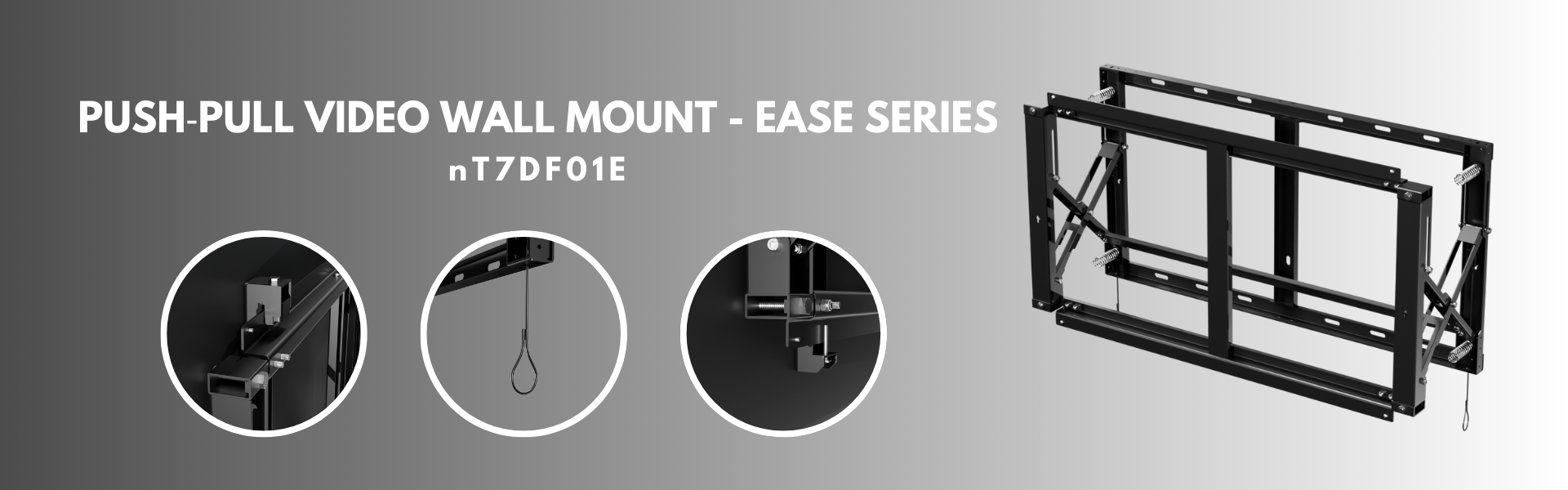 nT07DF01E Ease Series universal push pull video wall mount with X , Y , Z axis micro adjustments. Rugged construction with ease of use and smooth push pull function is best suitable for seamless and large installations of video walls.Suitable for 42?-75? displays , Vesa up to 600 x 400 mm and weight capacity up to 45 Kgs.Packed in a slim package – easy to assemble and very smooth and simple 3 axis keystone adjustments makes it simple to complete a perfect video wall solution .With a unique locking mechanism makes it function Push to open , push to lock and pull rope to unlock makes the access behid the display very simple and easy . Provided with spacing adapter to make perfect and fast spacing between each mounts . Suitable for control rooms , security rooms , digital signage , retail , auditorium , reception etc.